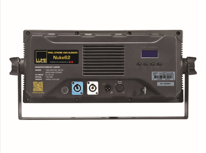 The NUKE62™ is a bright multi-purpose LED flood / blinder / strobe. Featuring 672 RGB LEDs and 140 high-power cool white LEDs, it boasts a high power output as a strobe or wash fixture. Stepless color blending, 3-IN-1 functionality, and 96-zone RGB pixel effects makes the NUKE 62 perfect for installations and rugged enough for production use.
